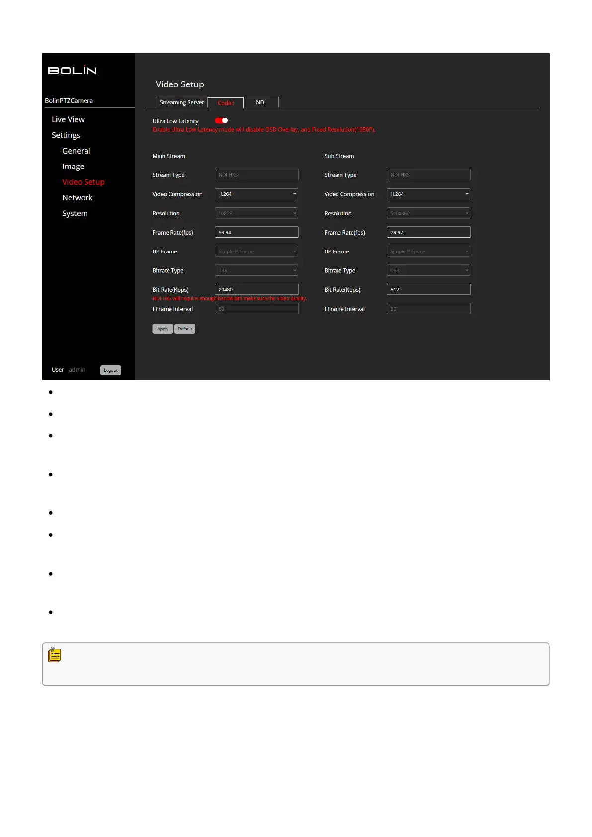 streaming conditions. Click Apply to save changes or Default to reset to factory settings.