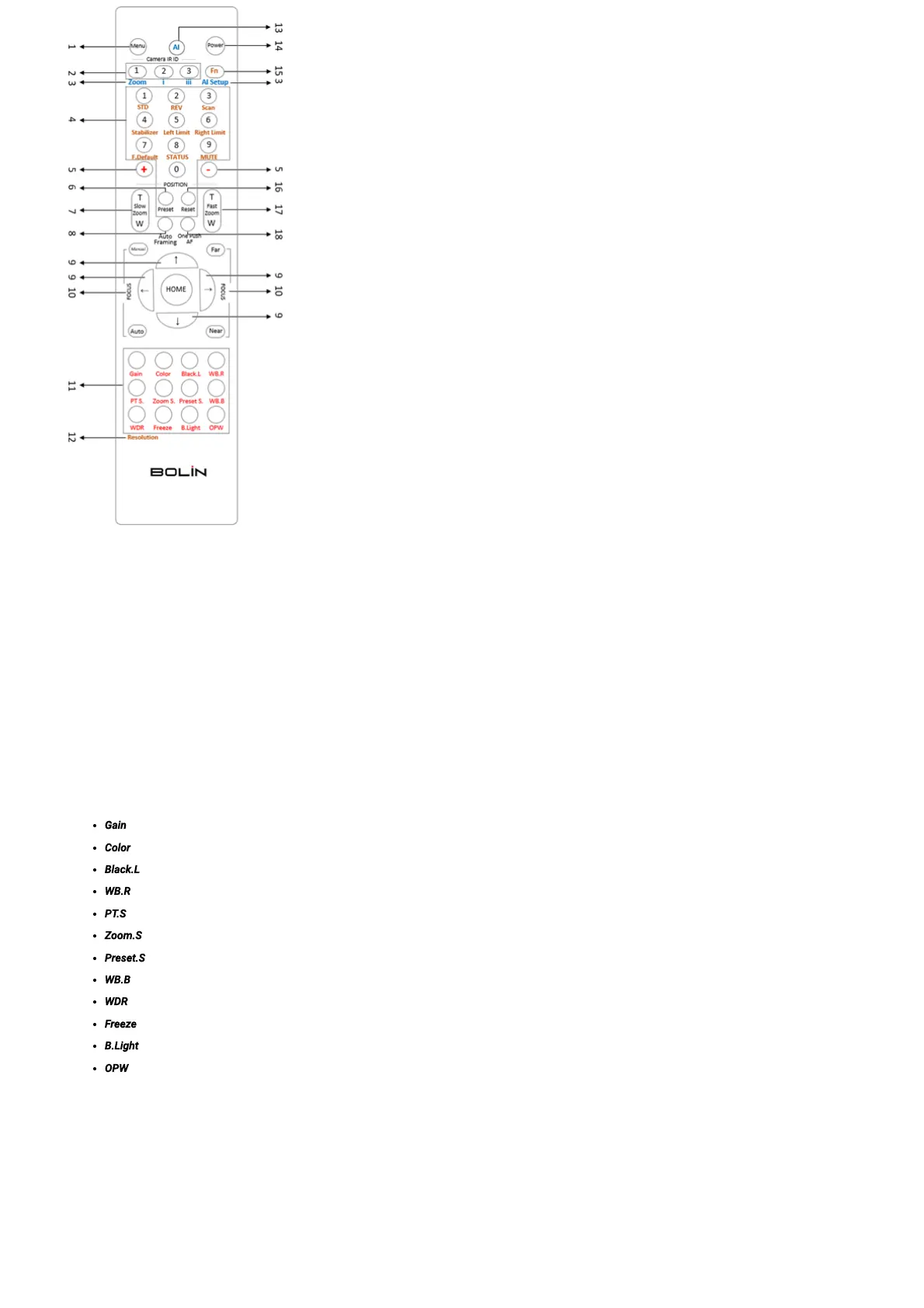 4. Buttons 1-9- Used to set & recall corresponding presets. (See #6 to set a preset and#16 to erase a preset)