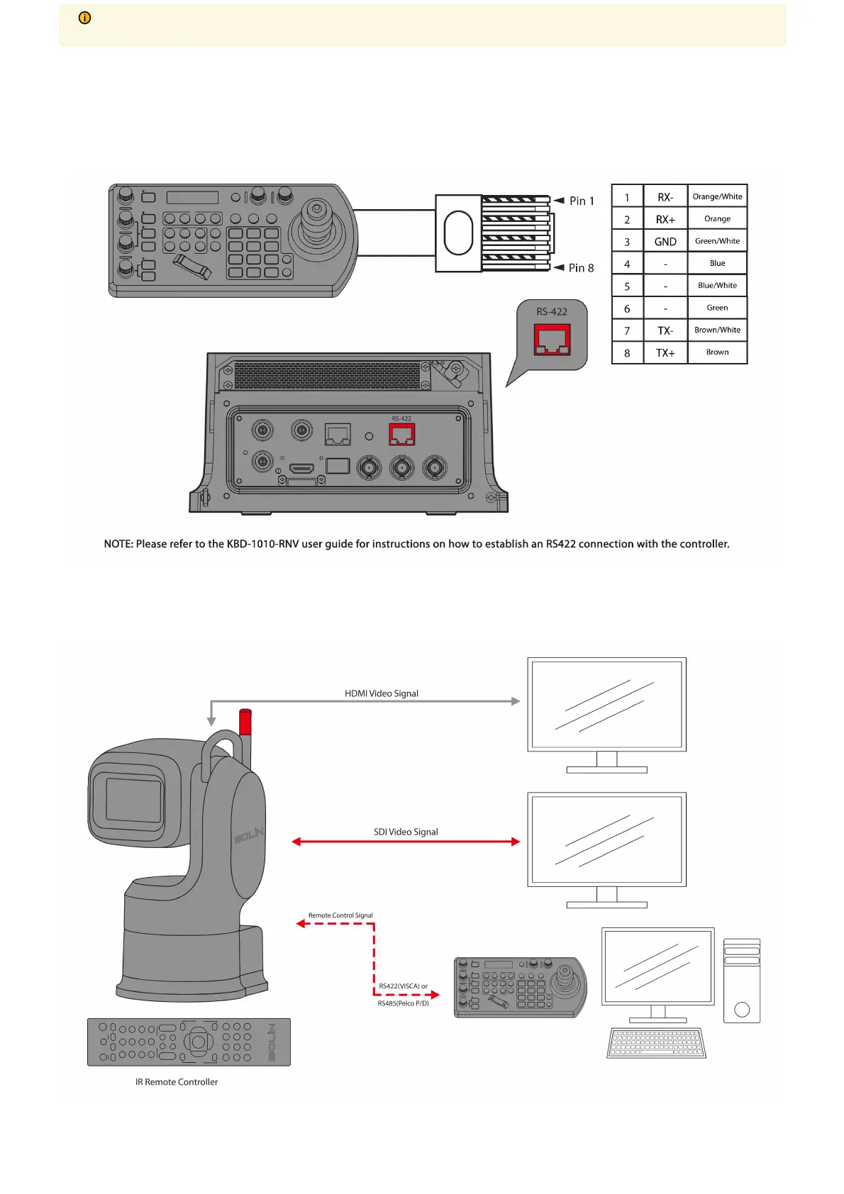 A standard terminated CAT5 or CAT6 cable can be used to directly connect the camera to the controller, or the included RJ45 to RS422 Control Cable Adapter