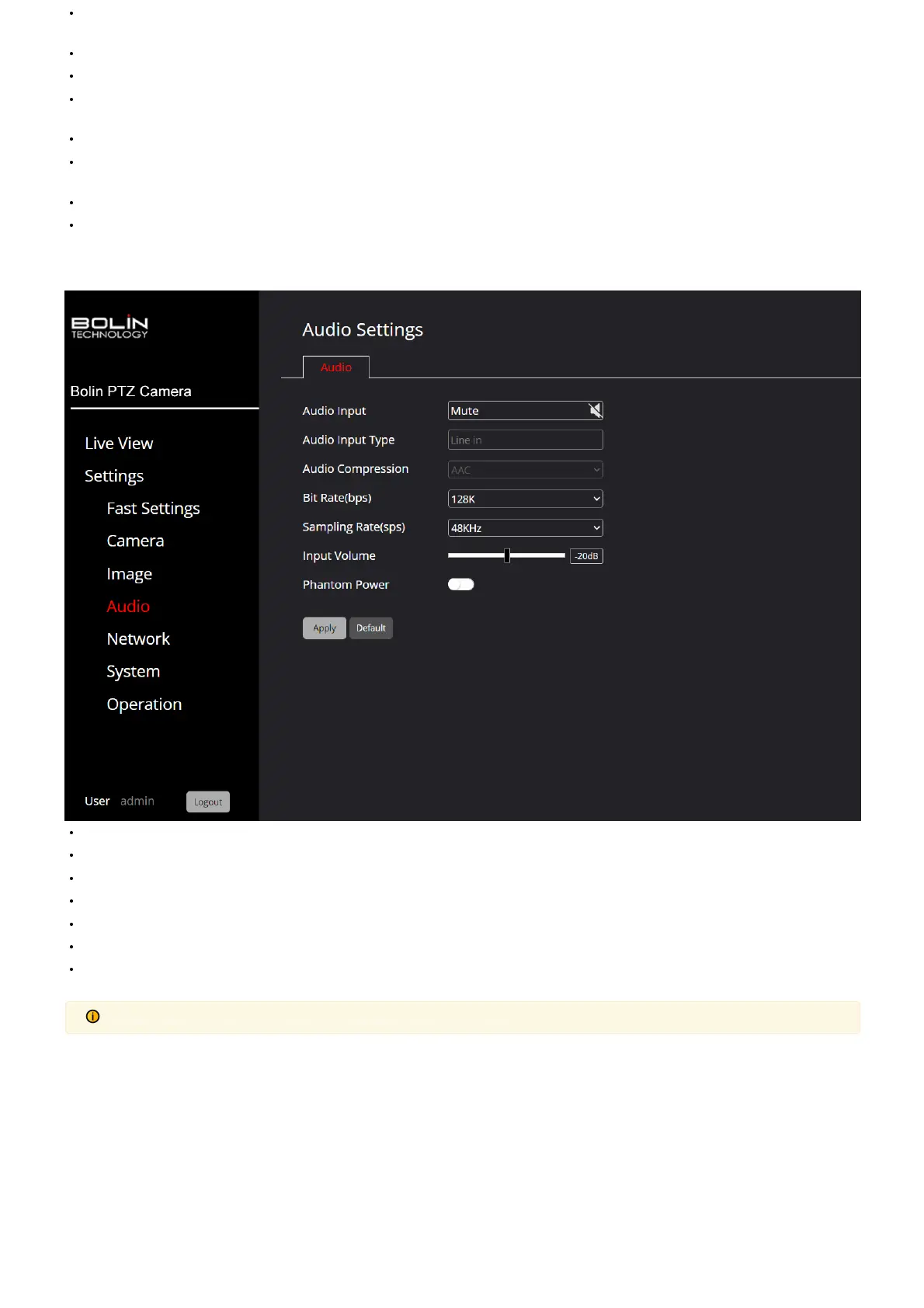 In the Audio tab, users can congure the audio settings on the camera to meet their requirements. The various settings and their functions are described below.