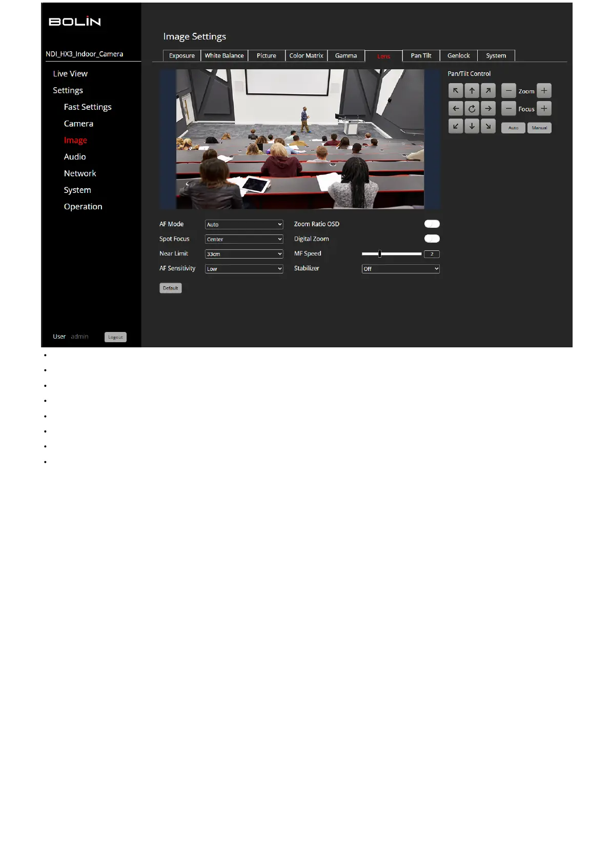 The PanTiltpage is utilized to designate the desired mode for pan, tilt, and zoom operations.