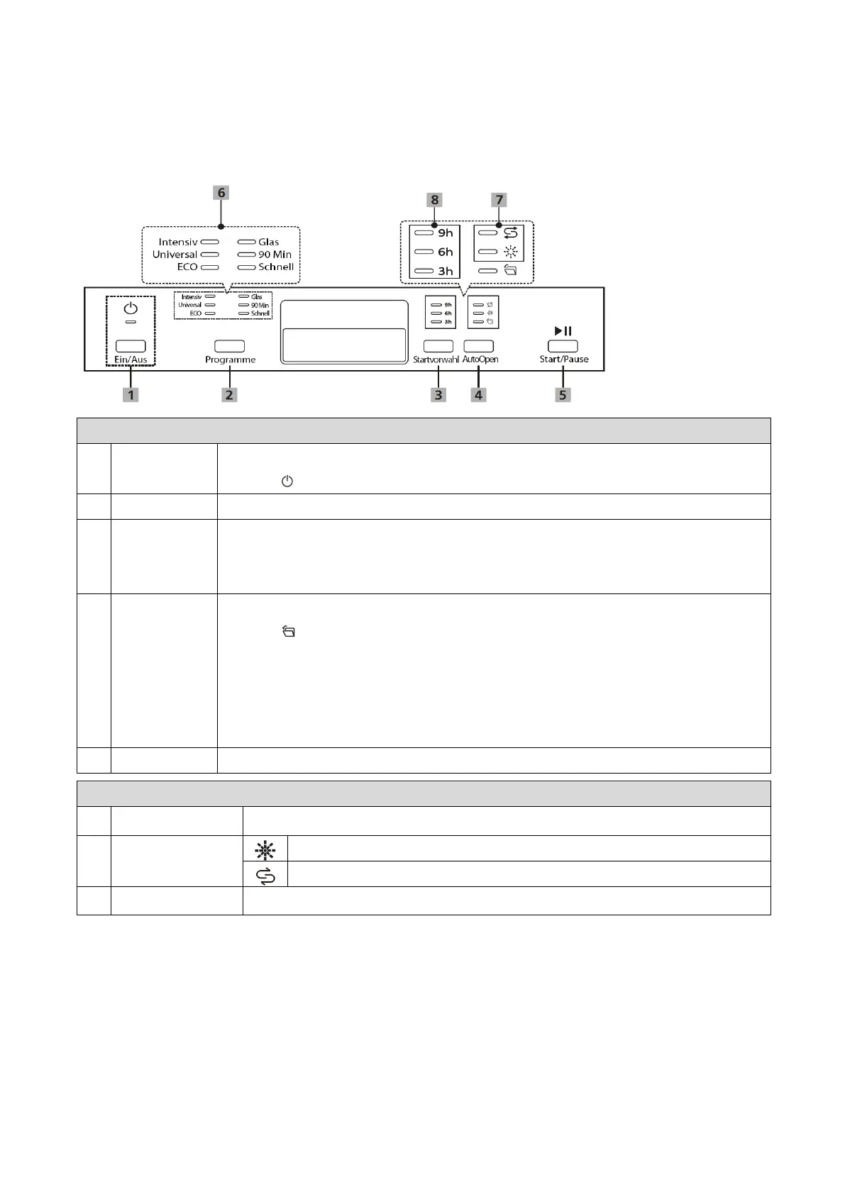 Startvorwahl Taste zur Wahl der Startverzögerung von 3, 6 oder 9 Stunden. Legen Sie die Be-