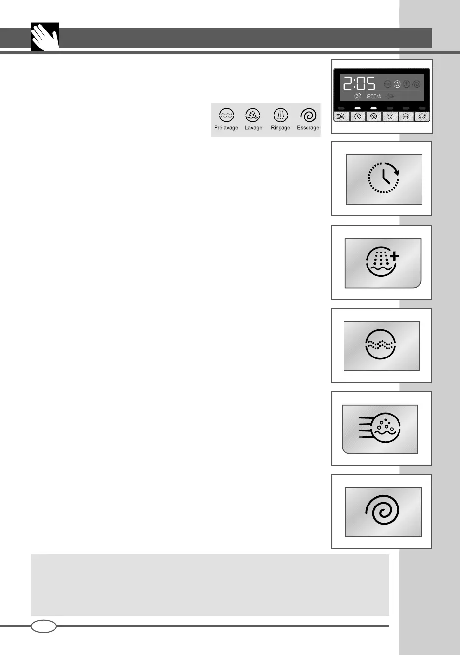 retardé, la vitesse d’essorage sélectionnée et le temps restant à la fin du cycle. Le