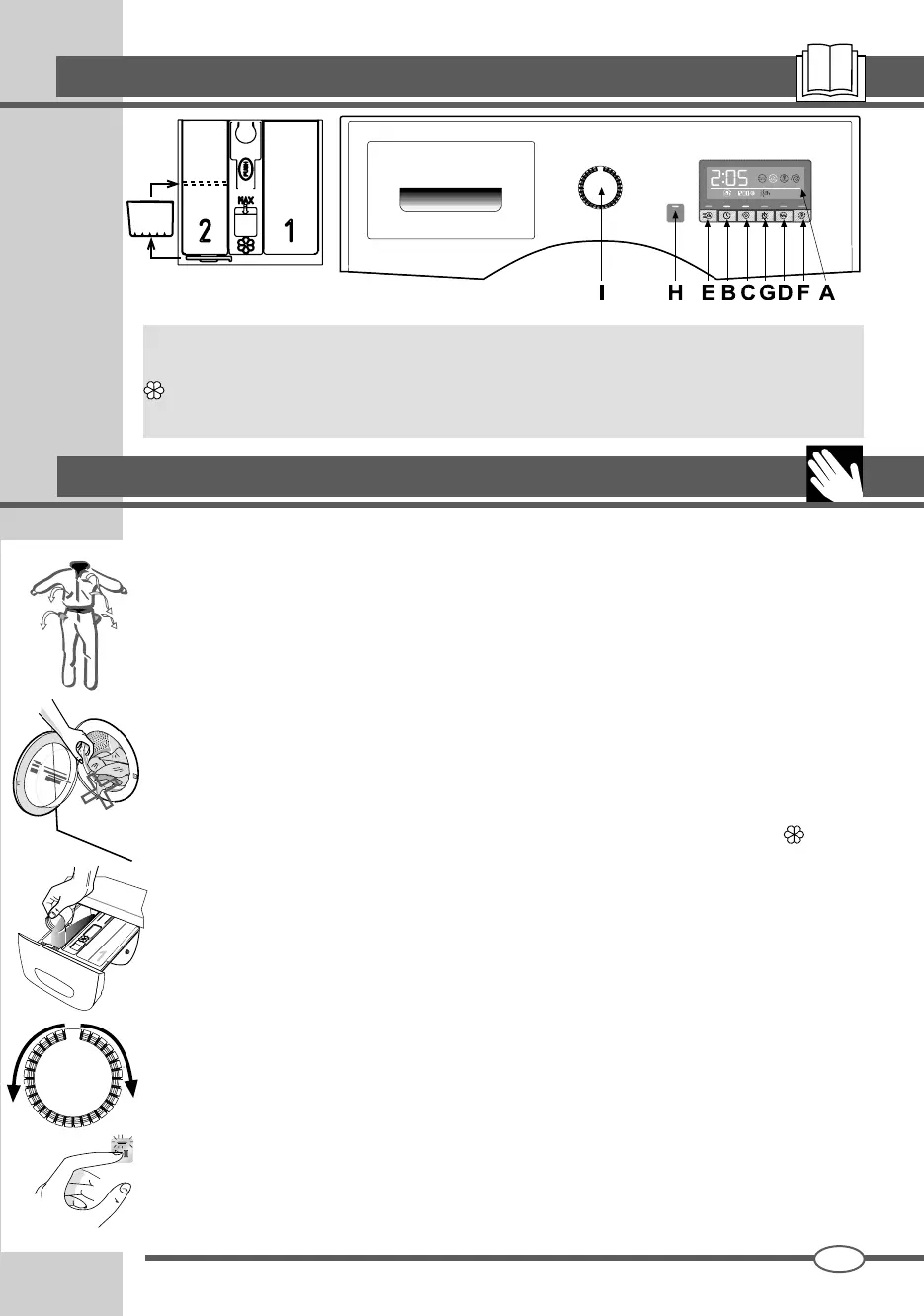 lessive dans le bac 1. Pour l’adoucisseur utiliser le bac portant le symbole spécifique . Après