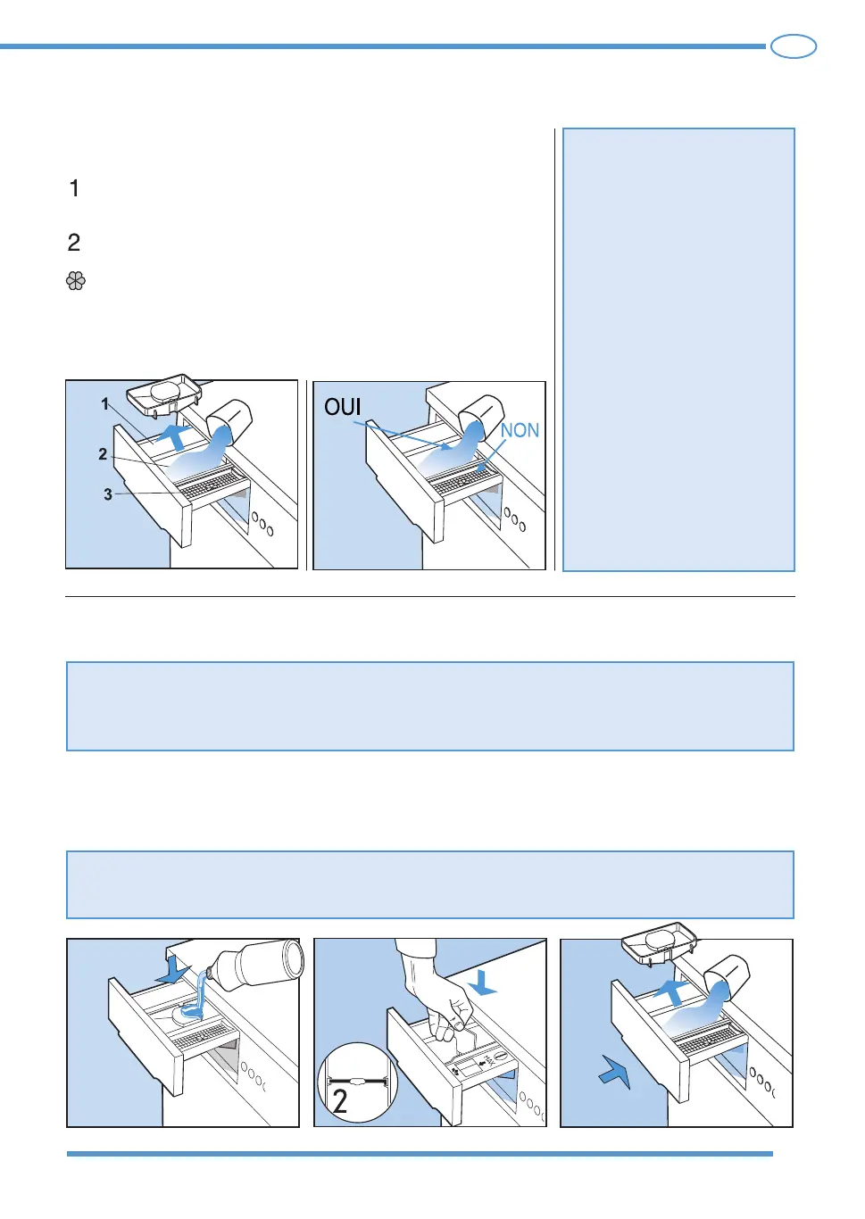 Ne pas oublier de retirer le récipient ou la cloison du détergent liquide quand on utilise du savon en poudre.