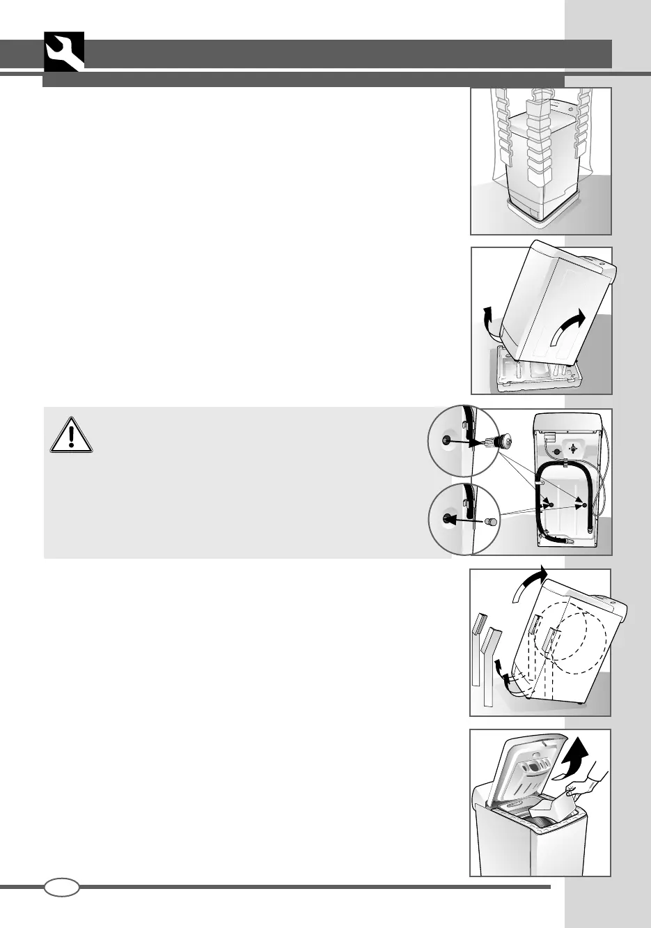 ▼ Incline the washing machine and extract the two internal polystyrene corner