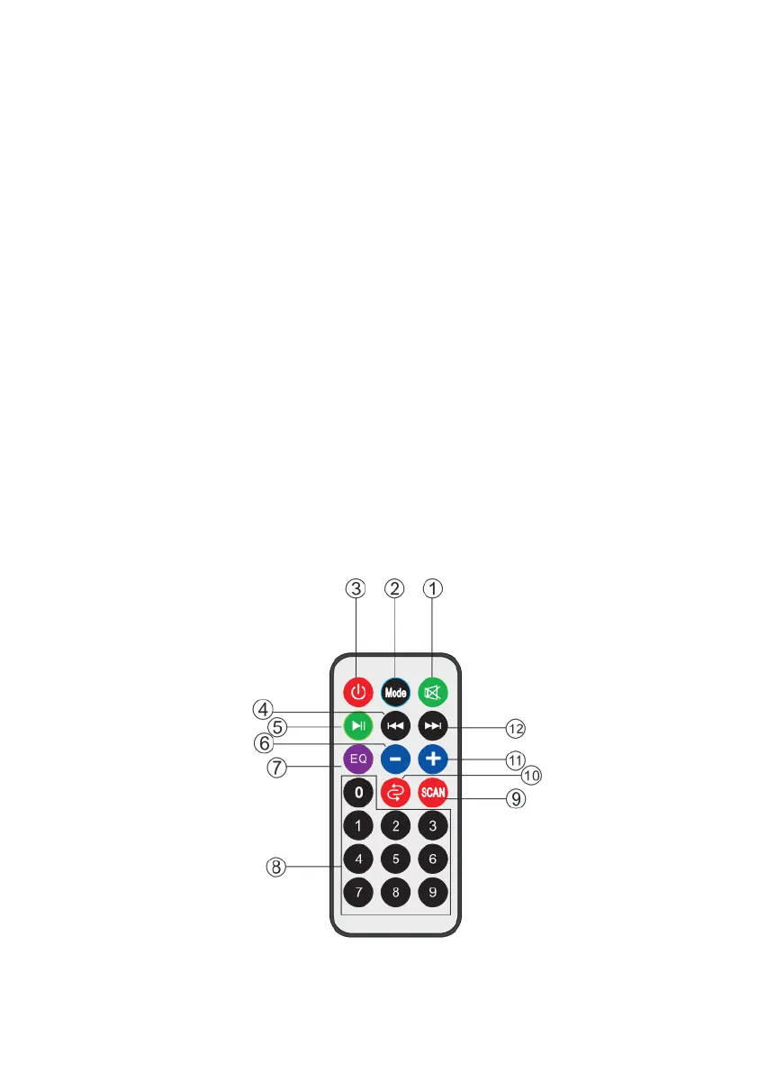 9. Play/Pause/TWS: Play/stop music in USB/Micro SD/BT mode, scan FM channel in