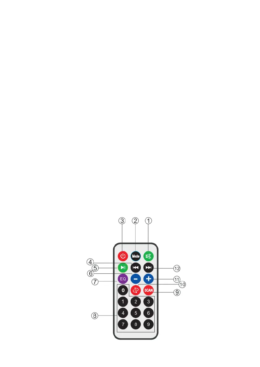 9.  Play/Pause/TWS : Lire/arrêter la musique en mode USB/Micro SD/BT, scanner la