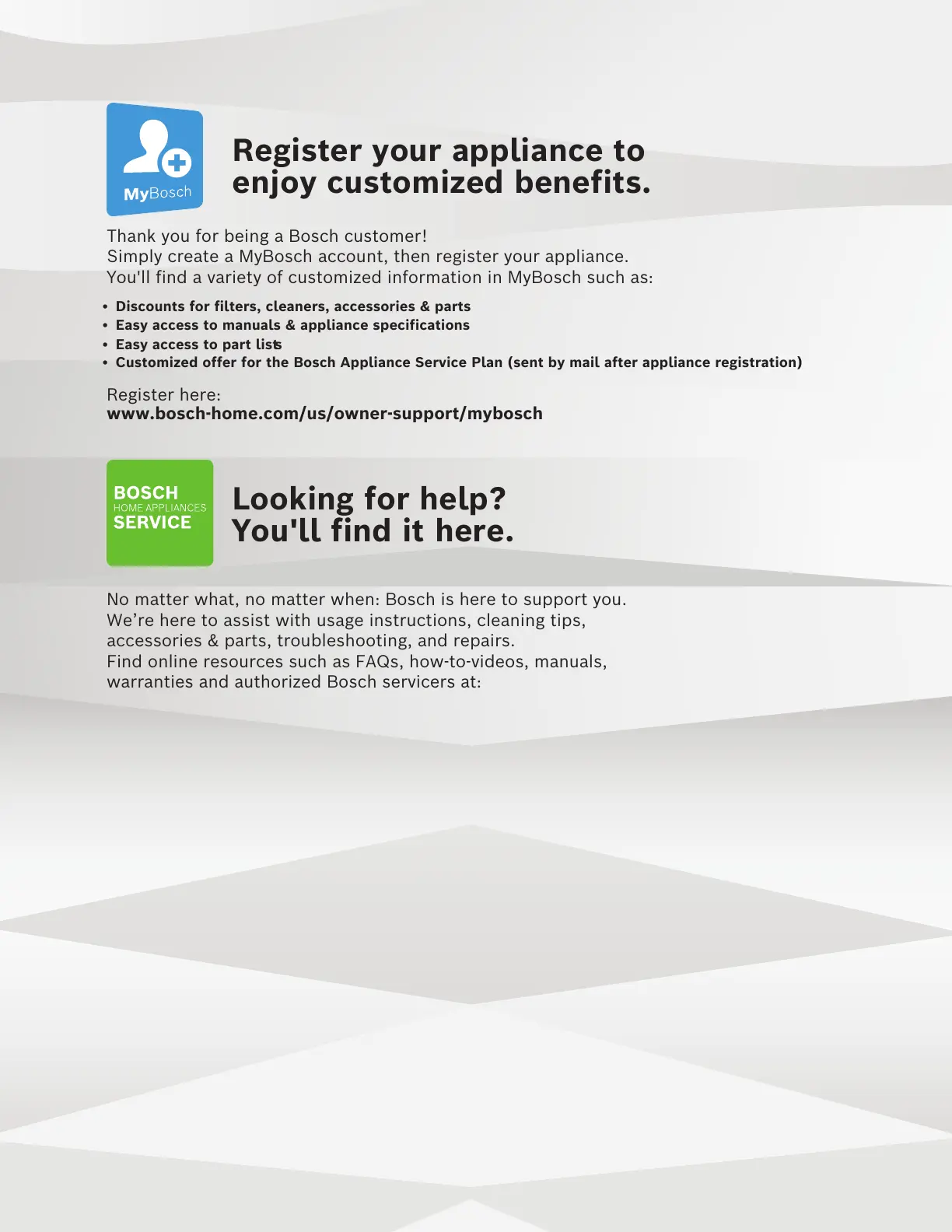 • Customized offer for the Bosch Appliance Service Plan (sent by mail after appliance registration)
