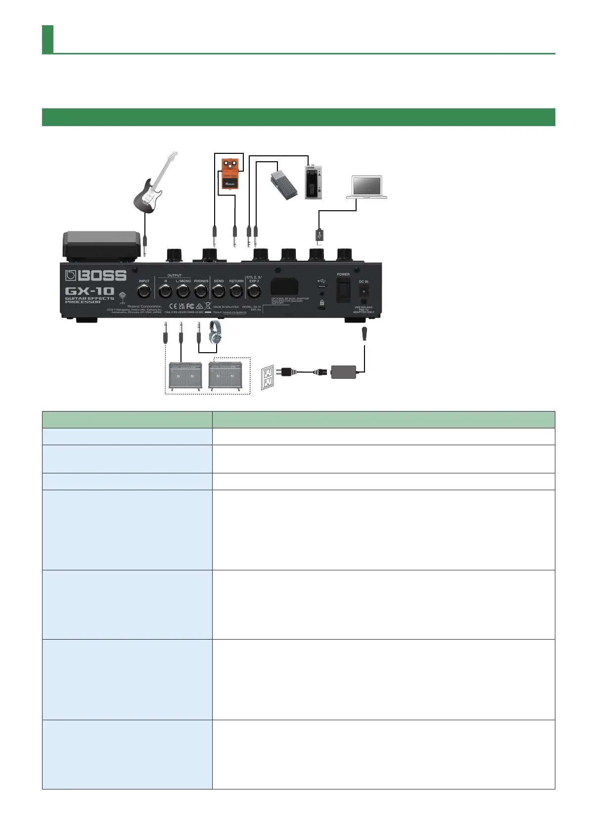 This chapter explains how to get ready to play with the GX-10, including connecting the devices, the instruments to use, how to make the basic