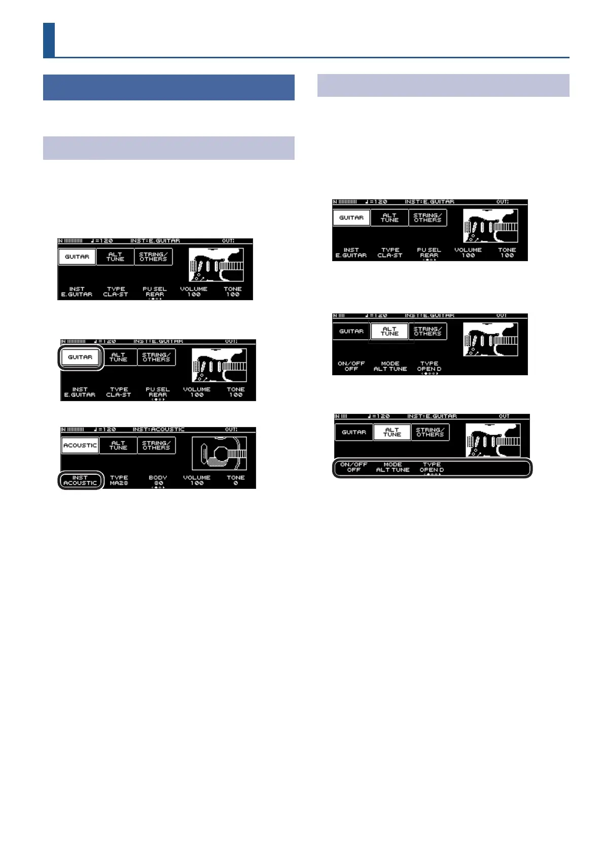 This explanation uses the edit screens for the E.GUITAR INST type as