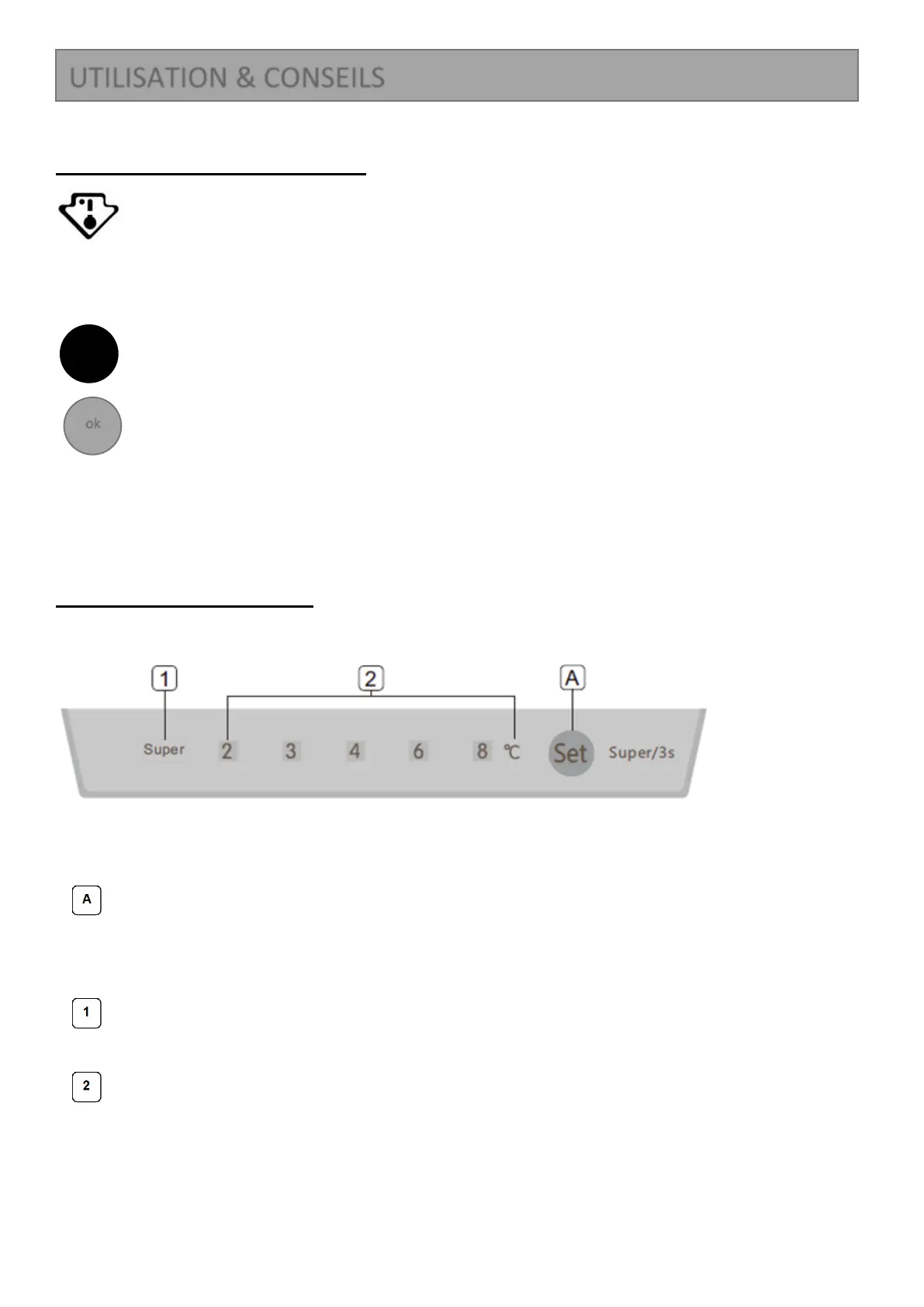Appuyez sur ce bouton pour choisir la température de fonctionnement et le mode « Super ».