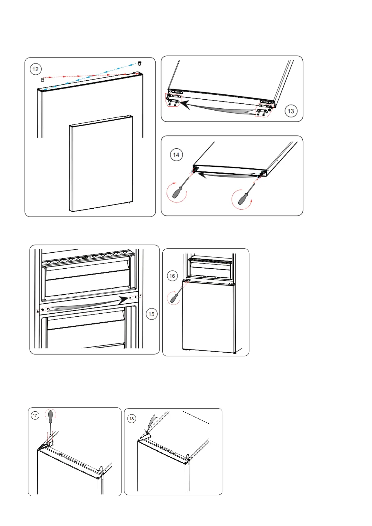 8. Installez la porte inférieure, puis ajustez et fixez la charnière intermédiaire sur l’armoire.