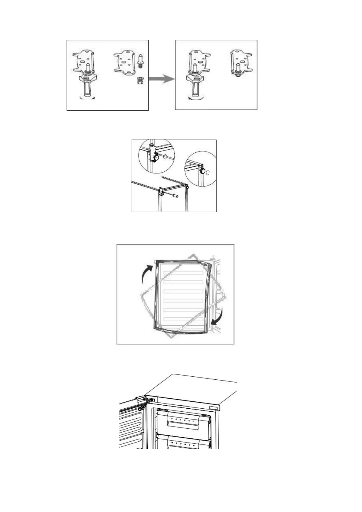5. Installez la charnière du bas de la gauche vers la droite. Replacez les deux pieds réglables.