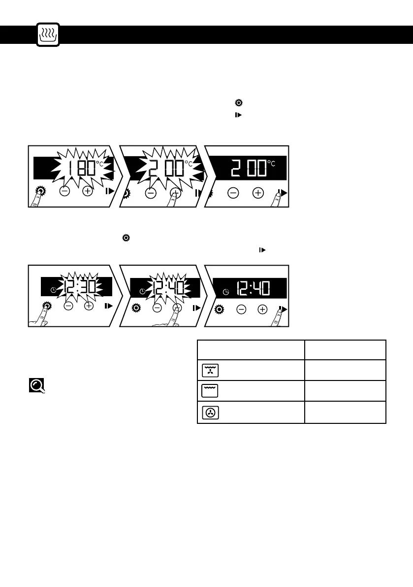 Trouba se zahřívá, funkce pečení bliká. Když trouba dosáhne zvolené teploty, ozve se série pípnutí.