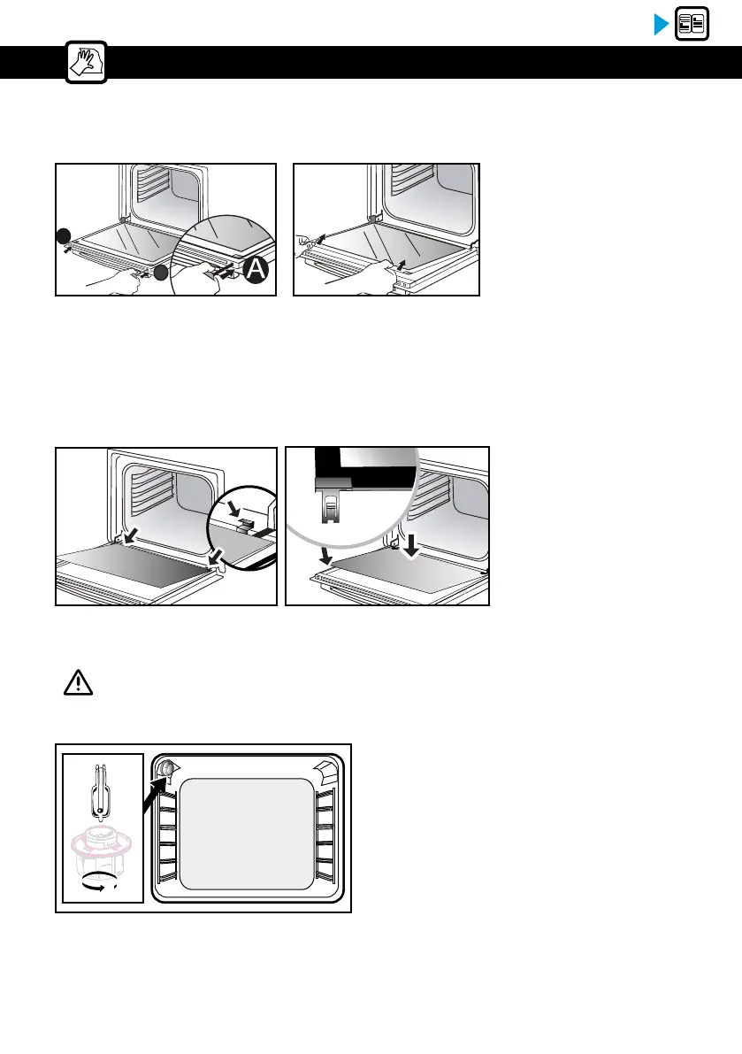 Après nettoyage, repositionnez et engagez la vitre dans les butées métalliques, ensuite clippez-la, face