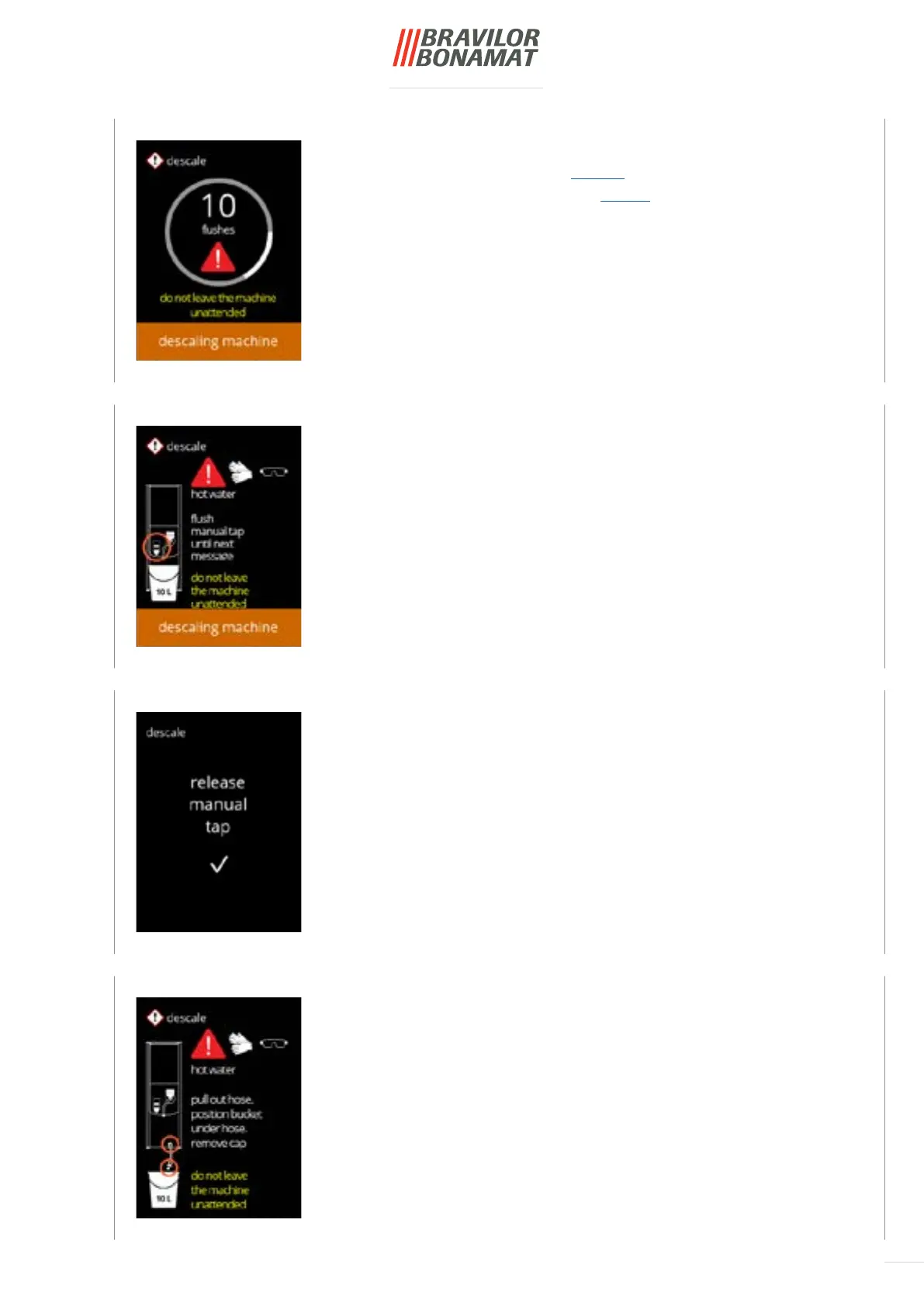 ► Hot water with descaling solution ows out of the beverage