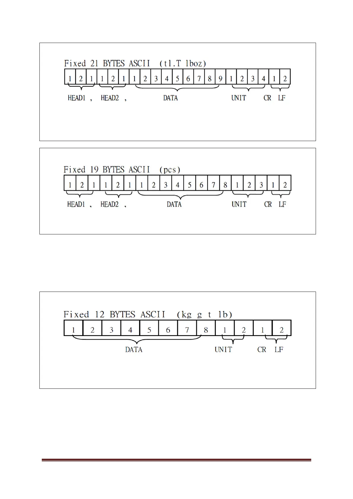 Units (metric, imperial or sample pieces) and CR/LF characters. No data about the weighing mode or