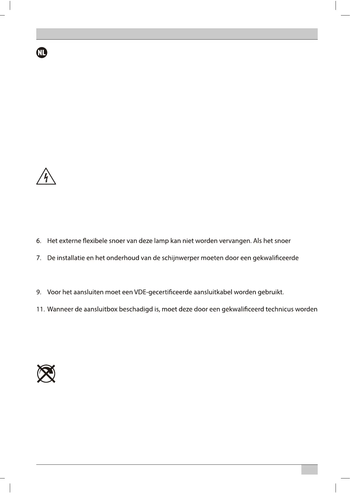 5. Een defect dekglas kan niet worden vervangen. De lamp moet dan als afval worden