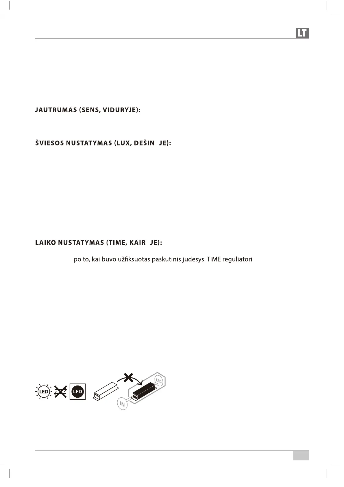 Nustatykite laiko jutikliui TIME minimalų laiką (10 s). Pasukite šviesos nustatymo reguliatorių