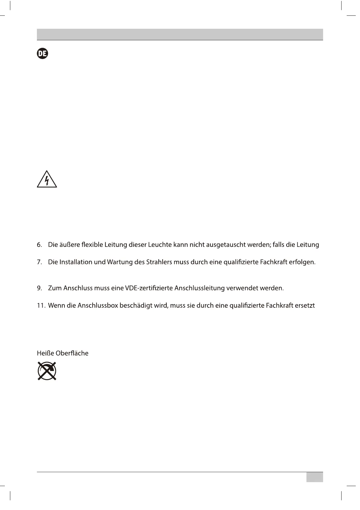 8. Elektroinstallationen dürfen nur unter Einhaltung der Sicherheitsvorschriften (VDE 0100 für