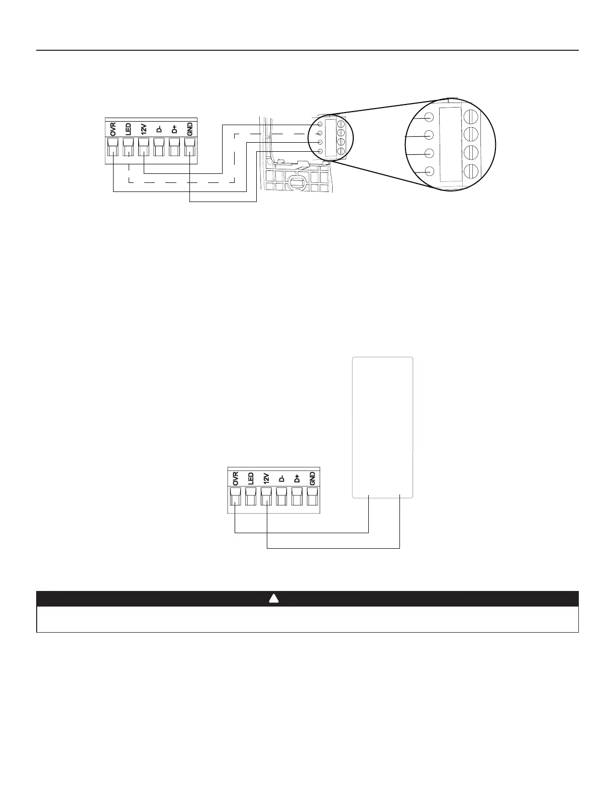 Un mal cableado que consiste en la conexión de un señal 24 VCA al bloque terminal de 6 posiciones (OVR, LED, 12V, D-, D+, GND)