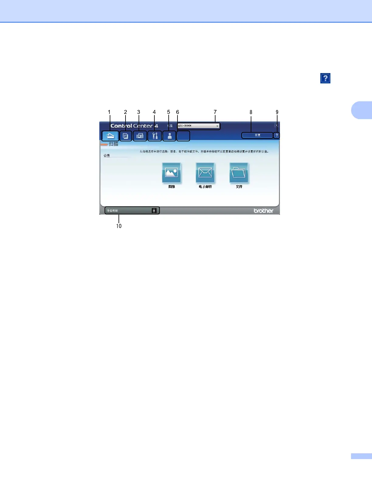 本节简要介绍高级模式下的 ControlCenter4 功能。 有关各功能的详细信息,请点击 (帮