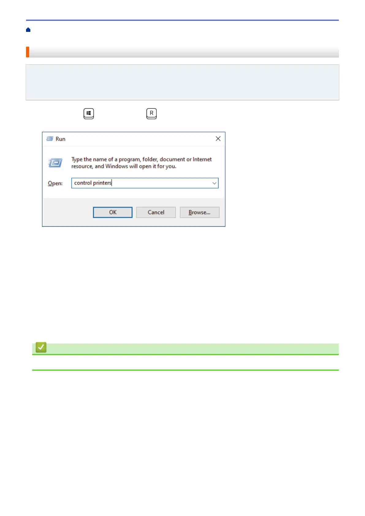 2. Type "control printers" in the Open: field and click OK.