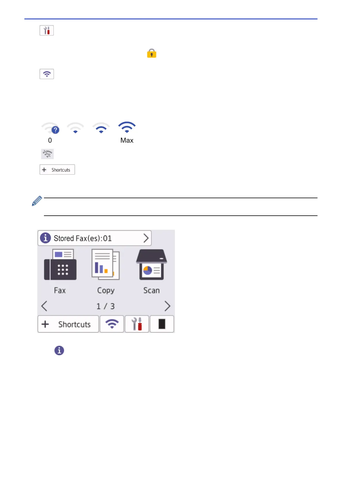 Press to create Shortcuts for frequently-used operations, such as sending a fax, making a copy, scanning,