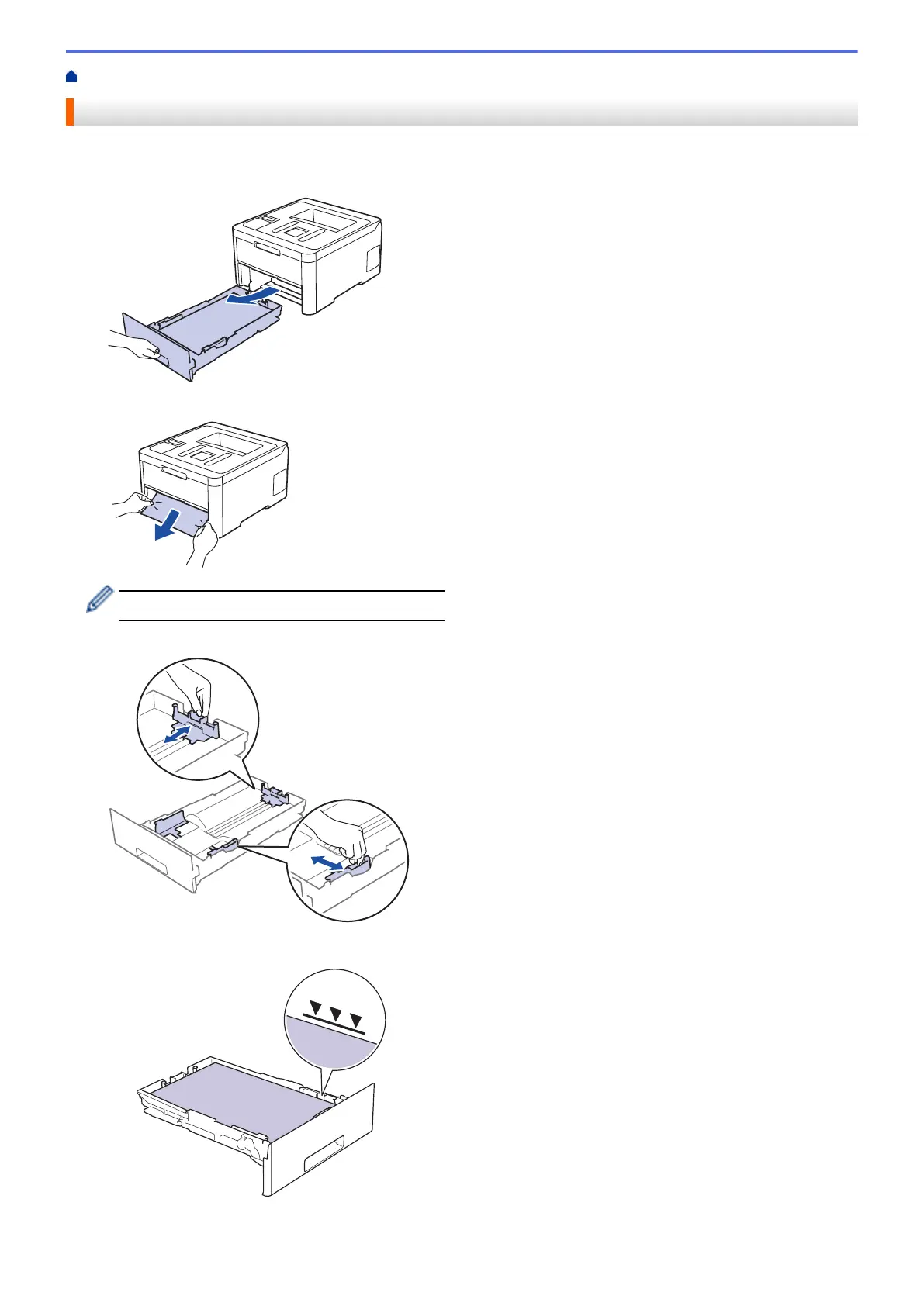 3. 展开堆叠的纸张以防卡纸,并滑动纸张导块,调整至所用纸张的尺寸。