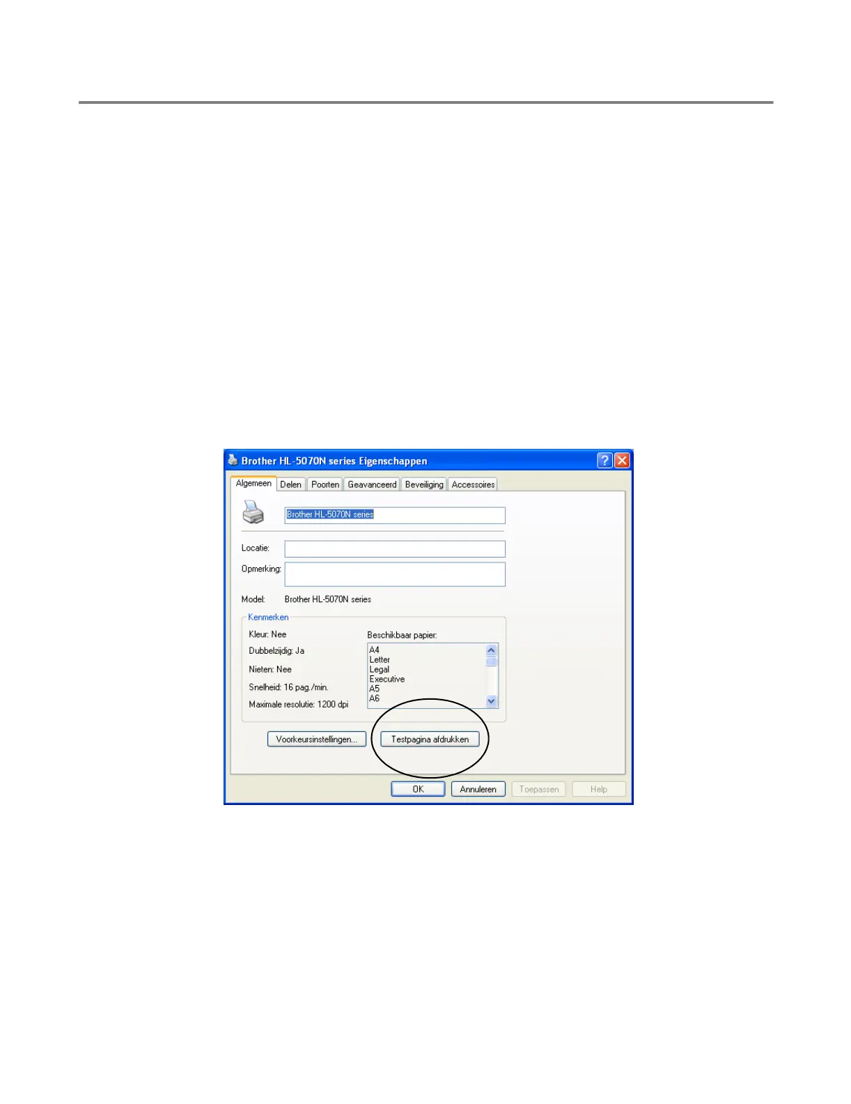 PCL-driver van Brother gebruikt, klikt u op de knop Testpagina afdrukken. Deze