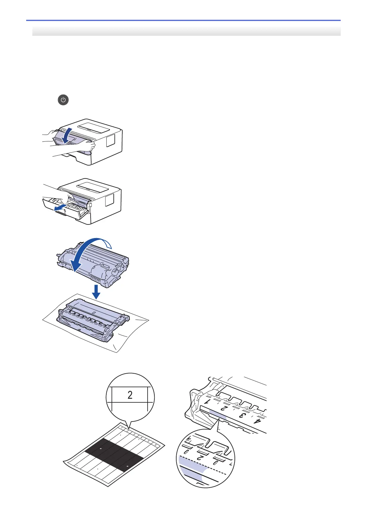 9. 根据硒鼓辊旁边的编号标记找到硒鼓上的印记。例如:如果检查表第 2 列中出现斑点,则表示在 “2” 硒鼓