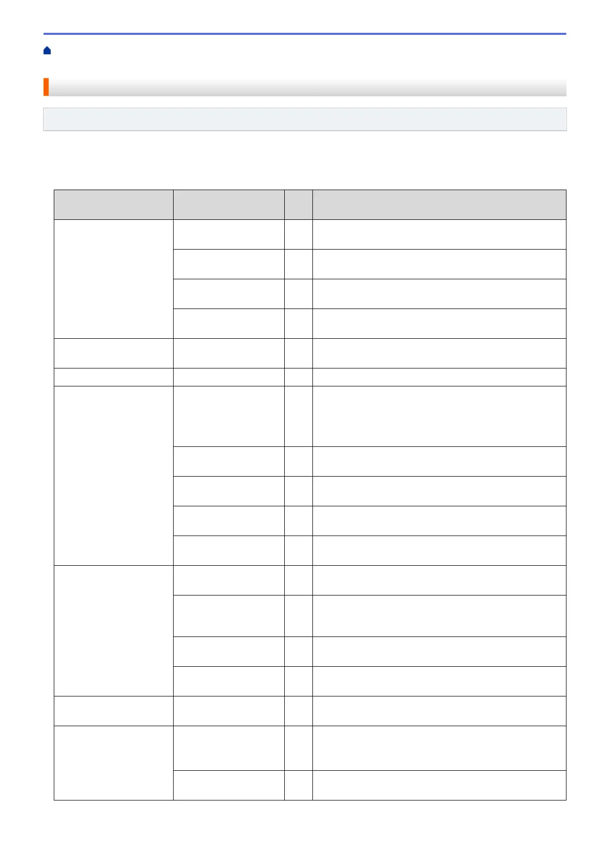 主页 > 设备设置 > 使用操作面板更改设备设置 > 菜单表 (适用于液晶显示屏型号) > 设置表 (1 行液晶显示