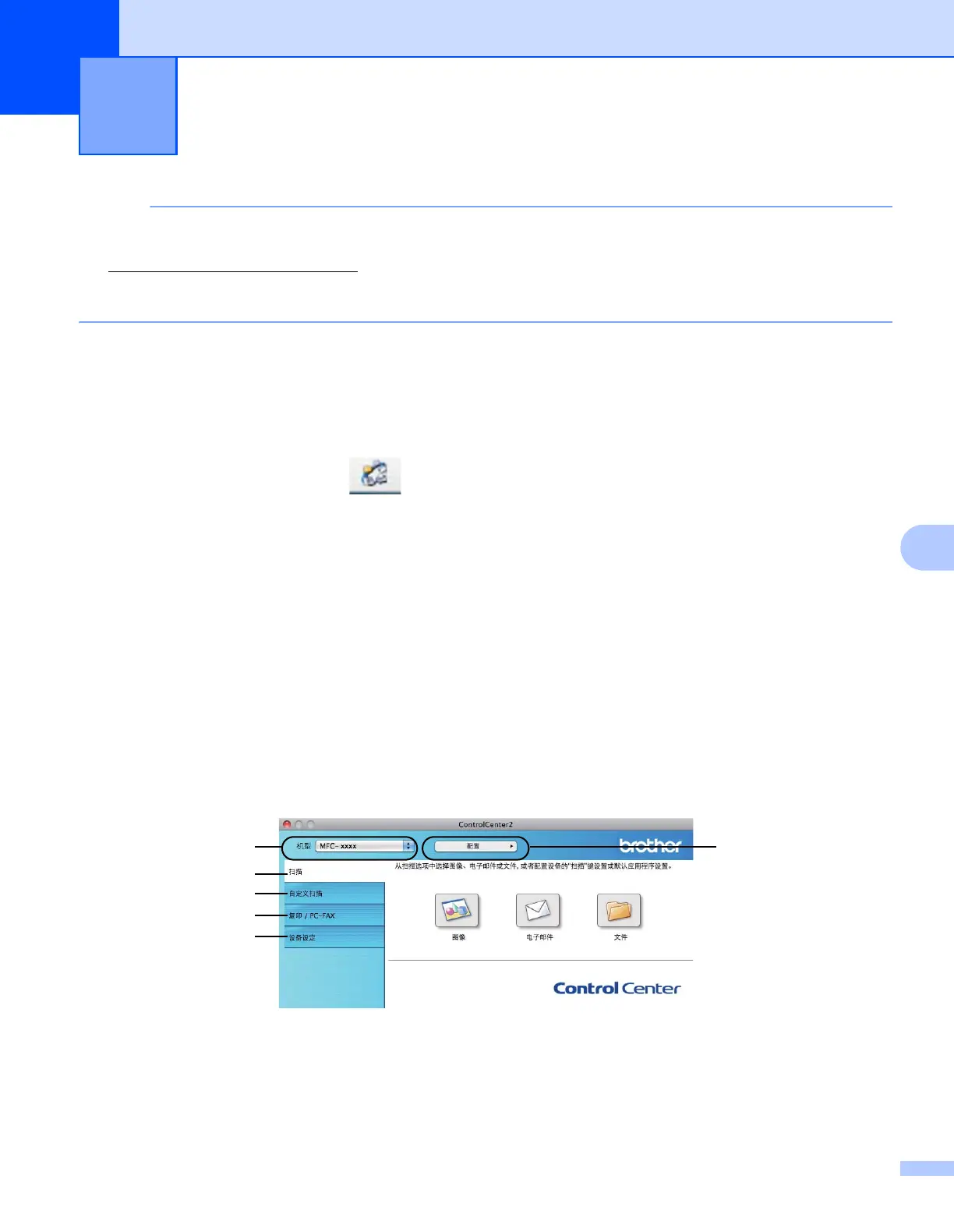 ControlCenter2 窗口,请点击 图标,然后选择打开。 ControlCenter2 提供了以下操