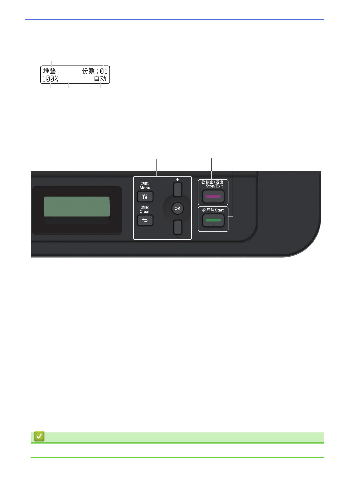 如果设备处于就绪模式或复印模式,液晶显示屏上将显示: