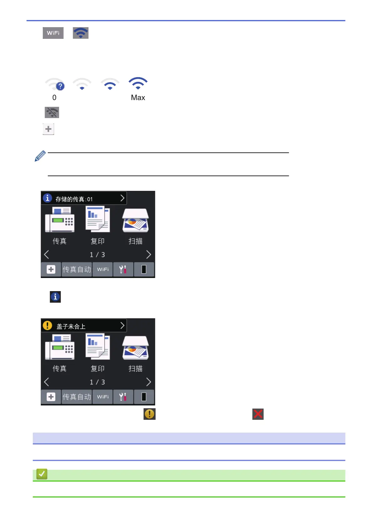 如果您在使用无线连接,各主页屏幕上的四级指示器会显示当前的无线信号强度。