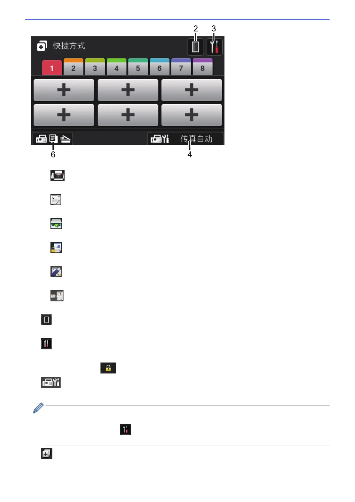 显示墨粉盒的剩余寿命。按此键可访问[墨粉]菜单。