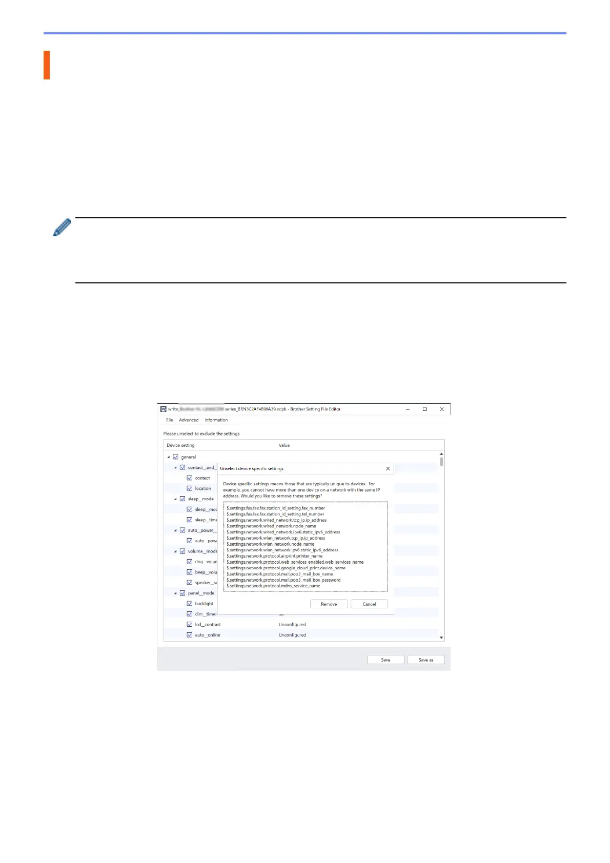 ● Remove all device-specific settings from the settings file (.json, .dpk, .edpk) at once, or remove only
