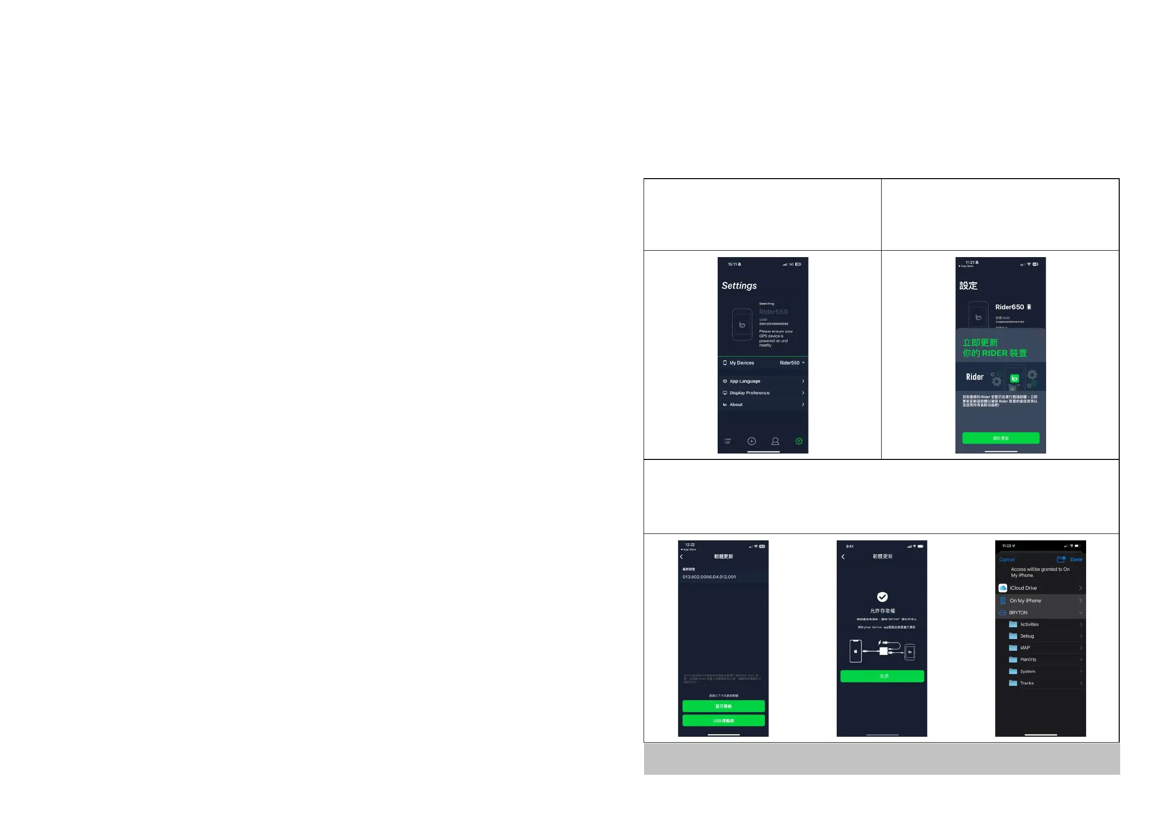 a. 利用藍芽將 Rider 550 與您的手機配對。 b. 韌體更新的訊息視窗會自動跳出,選擇確