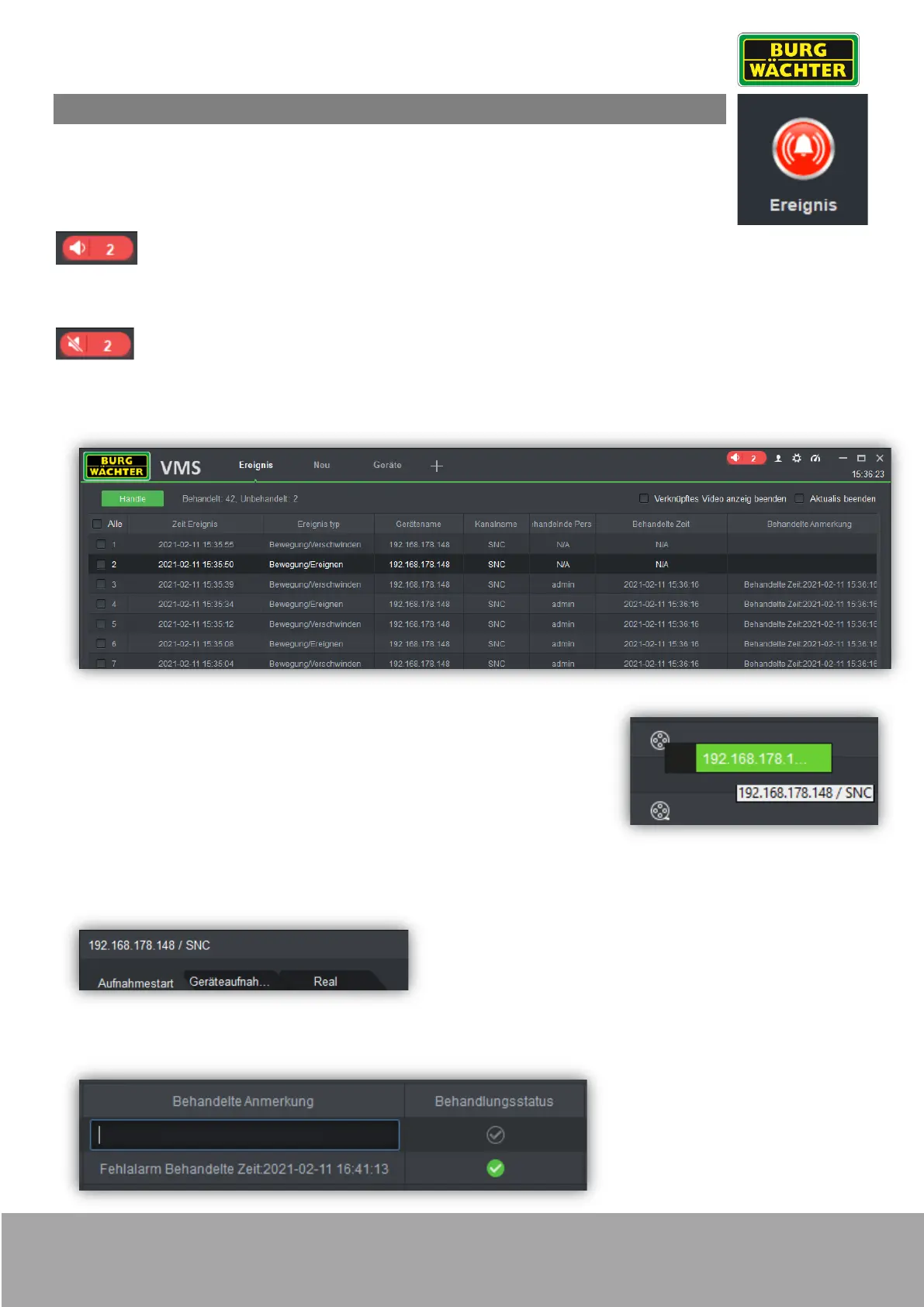 Die Alarmbehandlung kann als Bemerkung eingetragen und der Status durch anklicken als