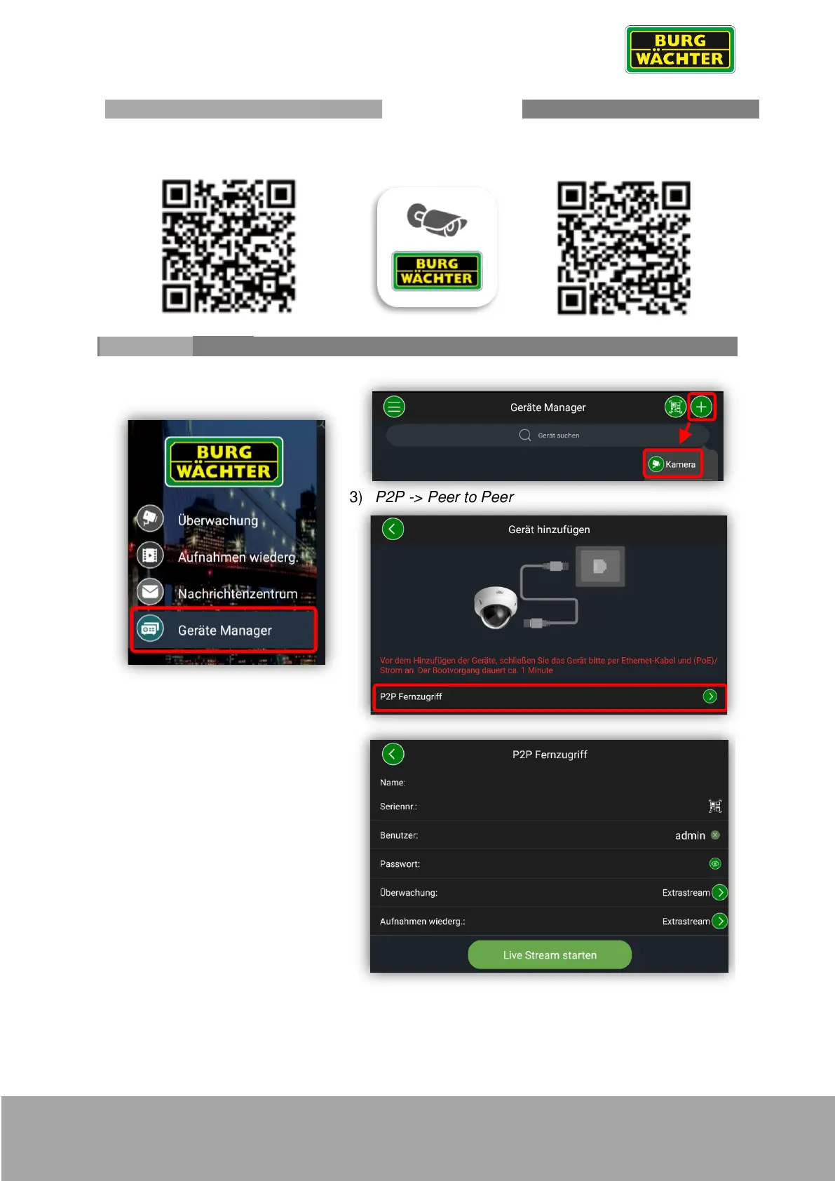 Hinweis: Die P2P Funktion muss in den Einstellungen der Kamera aktiviert sein. Stellen Sie