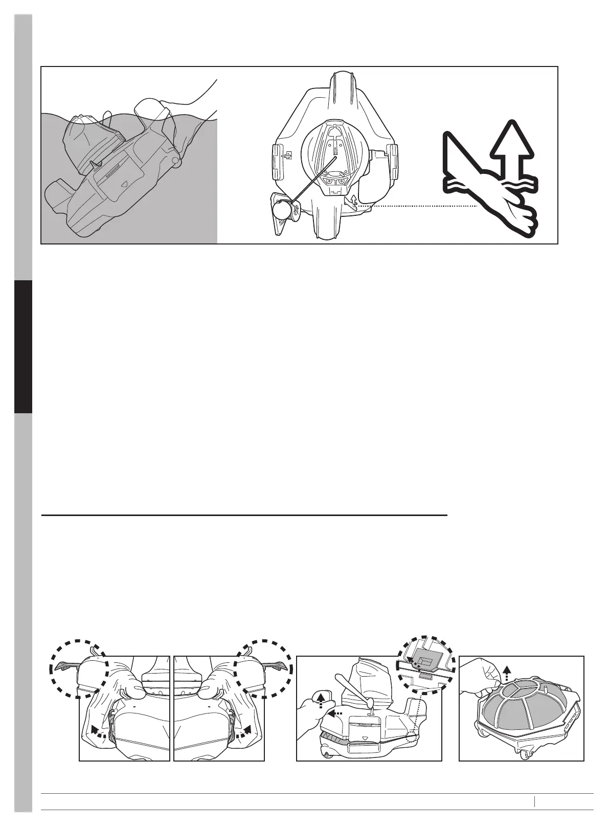Coloque el limpiafondos en una superficie plana. Levante los clips laterales simultáneamente para liberar la cubierta superior