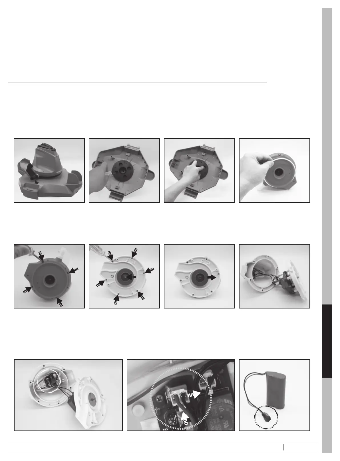 ensin. Irrota sitten kaikki ruuvit pohjasta kuvan osoittamalla tavalla. Irrota juoksupyörä ja avaa