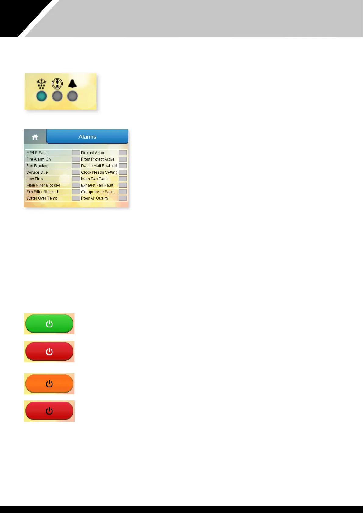 Orange (solid) - fan pressure alarm (if option fitted).