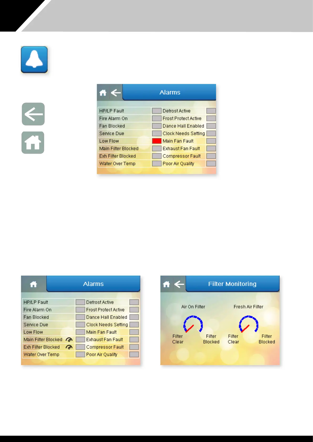 The Main Filter Blocked and Exhaust Filter Blocked alarm text is always shown,