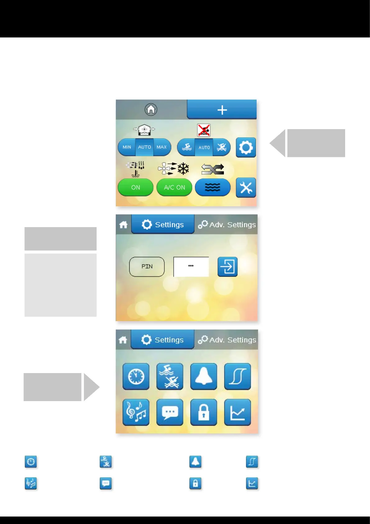 The main User Settings screens are protected by a PIN code. User Settings can be accessed by pressing e cog button on e second Home screen.