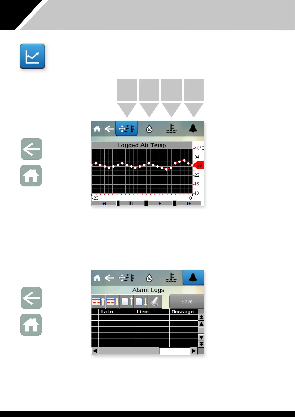from Air temperature, Humidity, Water temperature and Alarms. The display is