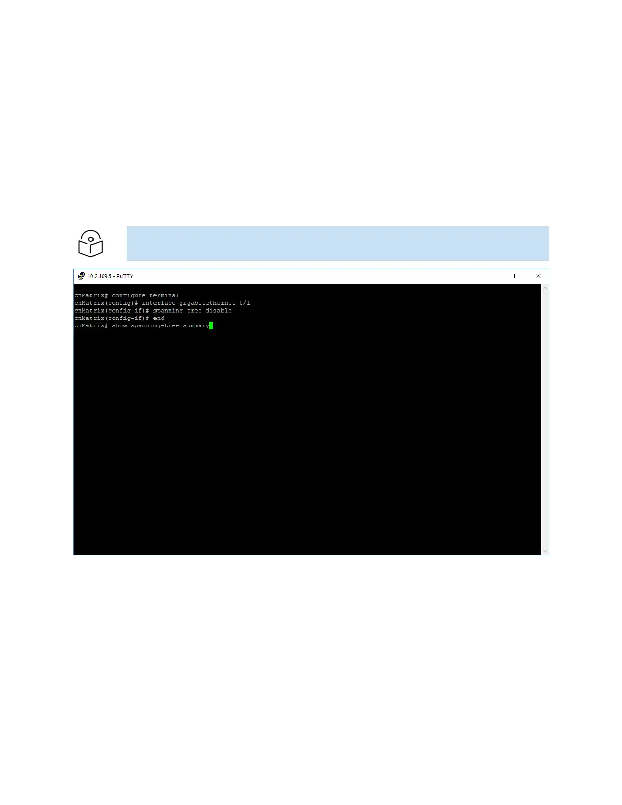 3. Type the spanning-tree disable command into the terminal. Press the Enterkey.
