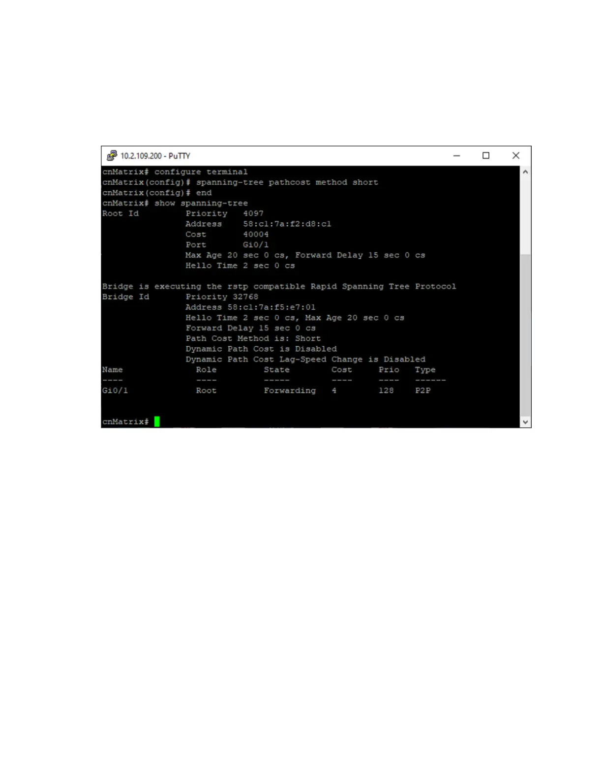 3. To verify the new configuration, type the show spanning-tree command into the terminal. Press