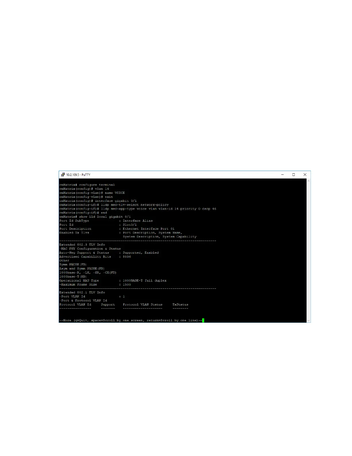 7. Type the lldp med-app-type voice vlan vlan-id 14 priority 0 dscp 46 command into the terminal to